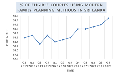 The Sri Lanka Demographic Health Survey (2016) reports a contraceptive prevalence rate as 65%, with 54% of users using a modern method.  COVID-19 pandemic had caused unprecedented impact on all health services and family planning services is no exception. Three rounds of Pulse Survey on continuity of essential health services conducted by World Health Organization (WHO)  revealed that family planning services had been  significantly impacted in  approximately one third of countries. Sri Lanka also followed the global trend with 5-25% service disruptions related to family planning service delivery by the end of 2021.